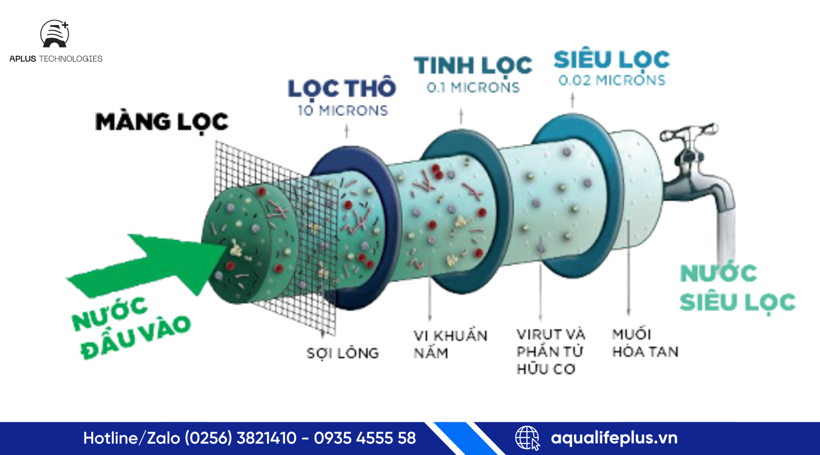 - Cấp UF: Màng siêu lọc 0.01 micron, loại bỏ vi khuẩn và tạp chất siêu nhỏ.