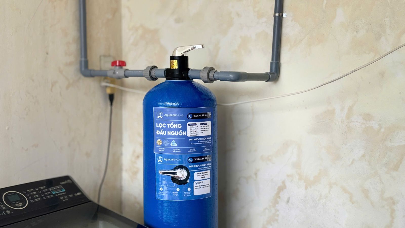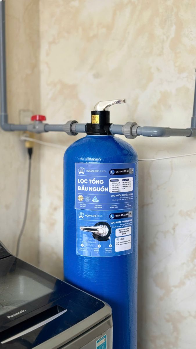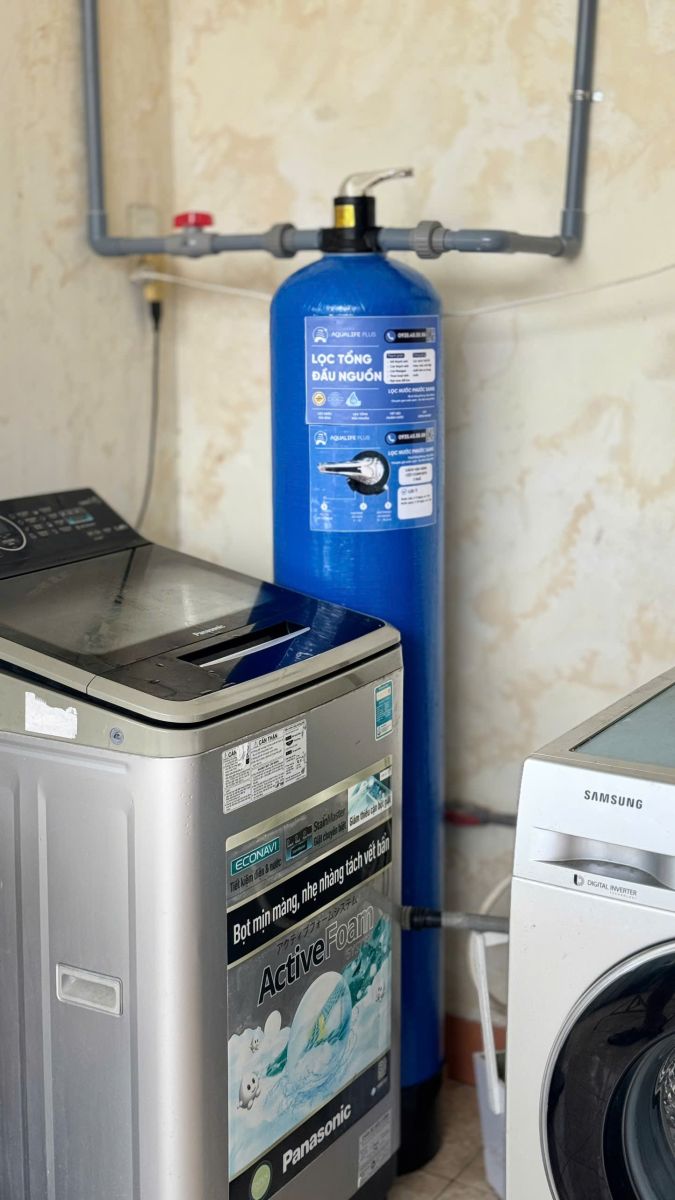 Sau khi khảo sát nguồn nước tại nhà ba mẹ anh H, đội ngũ Aqualife Plus đã tư vấn và lắp đặt hệ thống lọc tổng sinh hoạt. Đây là thiết bị giúp xử lý toàn bộ nguồn nước trước khi đưa vào sinh hoạt, giúp nước trong hơn, sạch hơn và an toàn hơn.