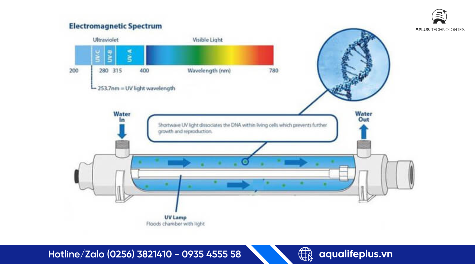Đèn UV 41W phát ra tia cực tím bước sóng 254 nm – dải bước sóng có khả năng phá vỡ DNA của vi khuẩn, virus, nấm và các vi sinh vật khác trong nước, ngăn chúng sinh sản và gây bệnh.