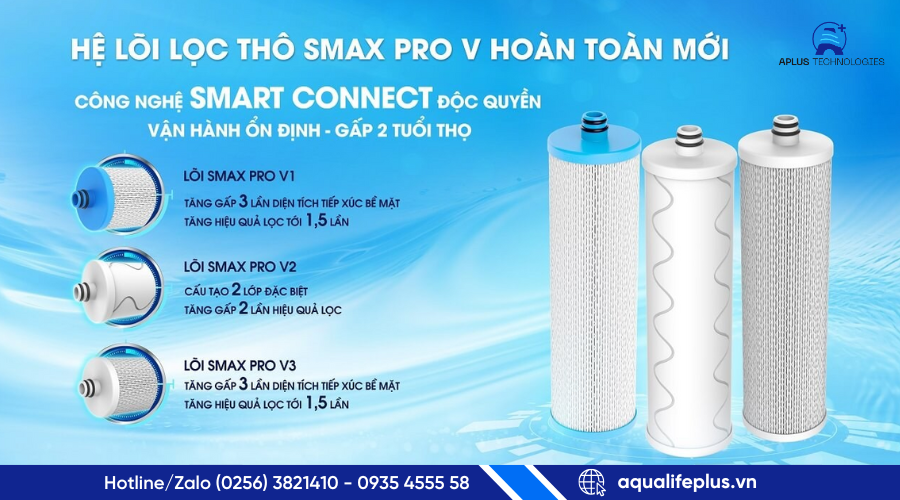 Lõi lọc thô Smax Pro V với 3 cấp: Với cấu trúc “rẻ quạt thông minh” giúp tăng gấp 3 diện tích tiếp xúc, nâng cao hiệu suất lọc cũng như kéo dài tuổi thọ lõi. Có khả năng loại bỏ cặn bẩn, bùn, sạn, clo dư, chất hữu cơ,... hiệu quả.