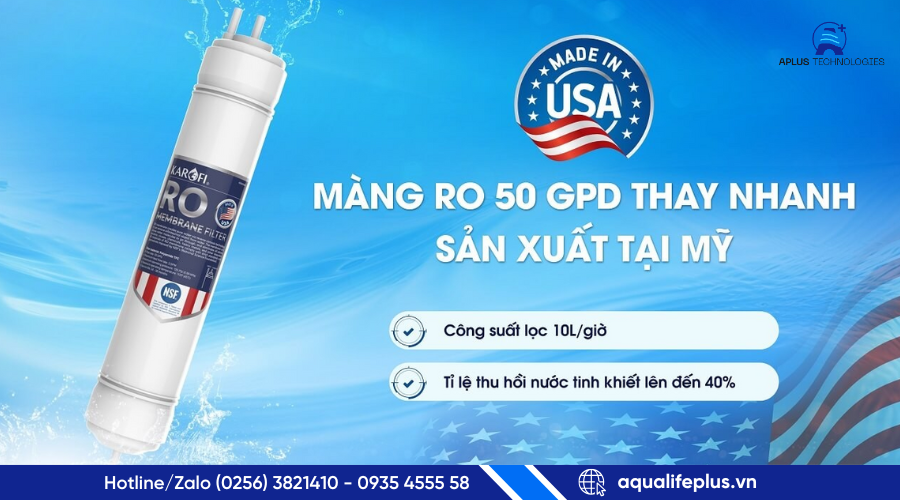 Màng RO 50 GPD nhập khẩu từ Mỹ: Đây là “trái tim” lọc, giúp loại bỏ hơn 99,99% clo, vi khuẩn, virus, asen, kim loại nặng và các chất độc hại - mang lại nguồn nước tinh khiết. Công suất lọc lên đến 10 lít/giờ, tỷ lệ thu hồi nước tinh khiết đạt khoảng 40%.