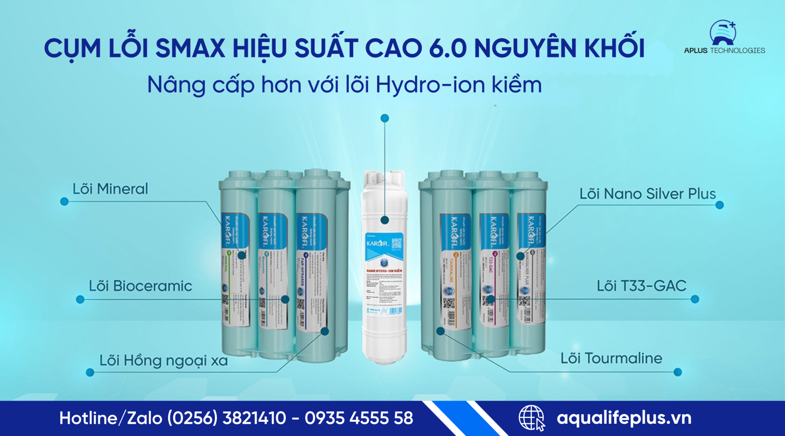 - Hệ thống 10 lõi lọc cao cấp, bao gồm lõi chức năng Hydrogen, Nano Silver, khoáng đá tự nhiên... giúp tăng vị ngọt tự nhiên và cải thiện chất lượng nước uống.