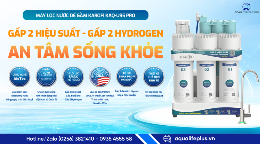 Máy lọc nước Karofi KAQ-U95 Pro là phiên bản cao cấp thuộc dòng máy lọc nước để gầm thông minh, ứng dụng công nghệ lọc RO Purifim 100 GPD kết hợp hệ lõi Smax Pro và lõi chức năng Hydrogen. Sản phẩm mang đến nguồn nước tinh khiết, giàu khoáng của nước. Với thiết kế vòi LED hiện đại, báo chất lượng nước trực quan, cùng khả năng tự động cảnh báo thay lõi và rò rỉ, Karofi KAQ-U95 Pro là giải pháp nước sạch toàn diện, bền bỉ và tiện nghi cho mọi gia đình hiện đại.
