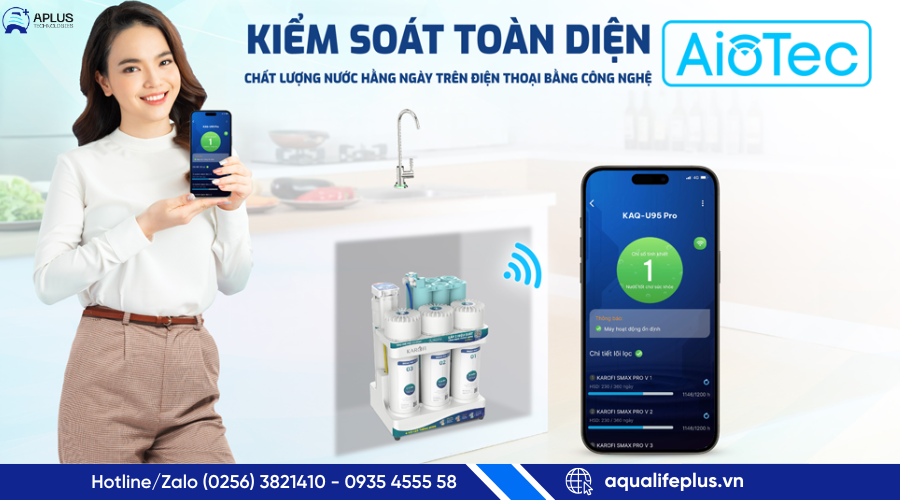 - Công nghệ AioTec giám sát từ xa qua điện thoại, cảnh báo khi cần thay lõi, rò rỉ hoặc khi nguồn nước cấp yếu.