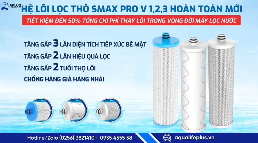 Trang bị 3 lõi lọc thô Smax Pro V với diện tích tiếp xúc gấp 3 lần và hiệu quả lọc gấp 2 lần so với thế hệ trước, công nghệ Smart Connect giúp chống hàng giả, hàng nhái hiệu quả, kéo dài tuổi thọ lõi đến 12 tháng và bảo vệ tối ưu cho toàn bộ hệ thống lọc bên trong máy.