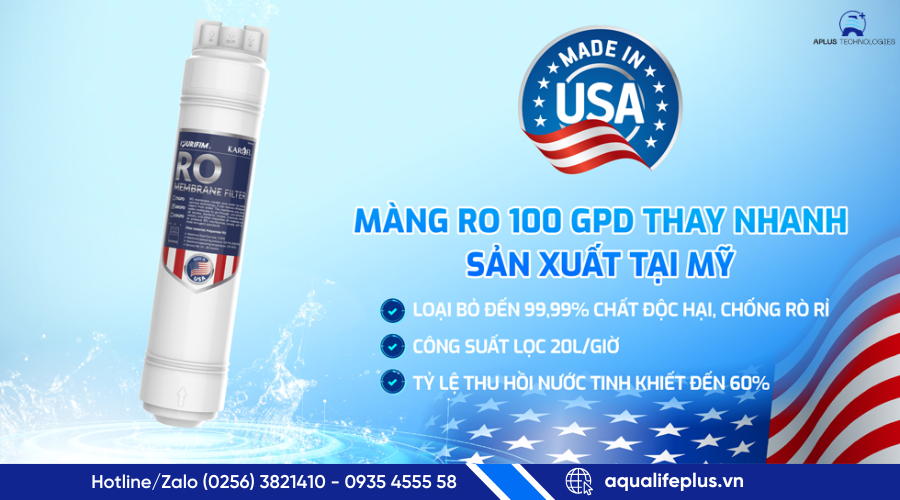 - Màng RO Purifim 100 GPD sản xuất tại Mỹ, lọc sạch các vi khuẩn, virus và kim loại nặng một cách hiệu quả.
