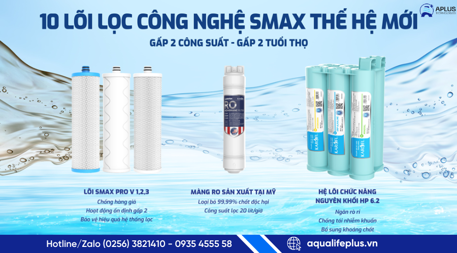 10 lõi công nghệ Smax (3 lõi thô Smax Pro V + 6 lõi chức năng HP6.2 + màng RO) |