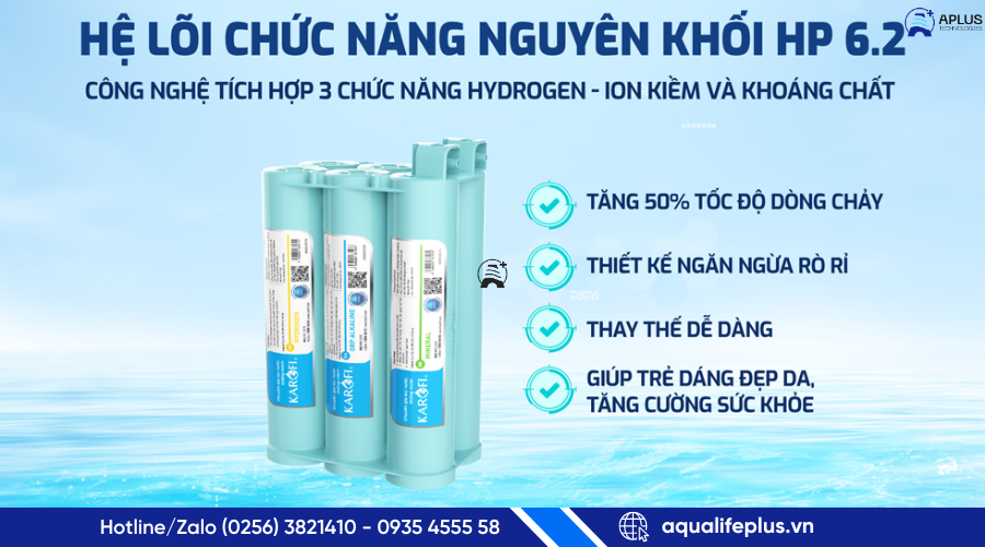 - Hệ chức năng HP 6.2 tích hợp Hydrogen, ion kiềm và khoáng chất giúp nước sau lọc tốt hơn cho sức khỏe.