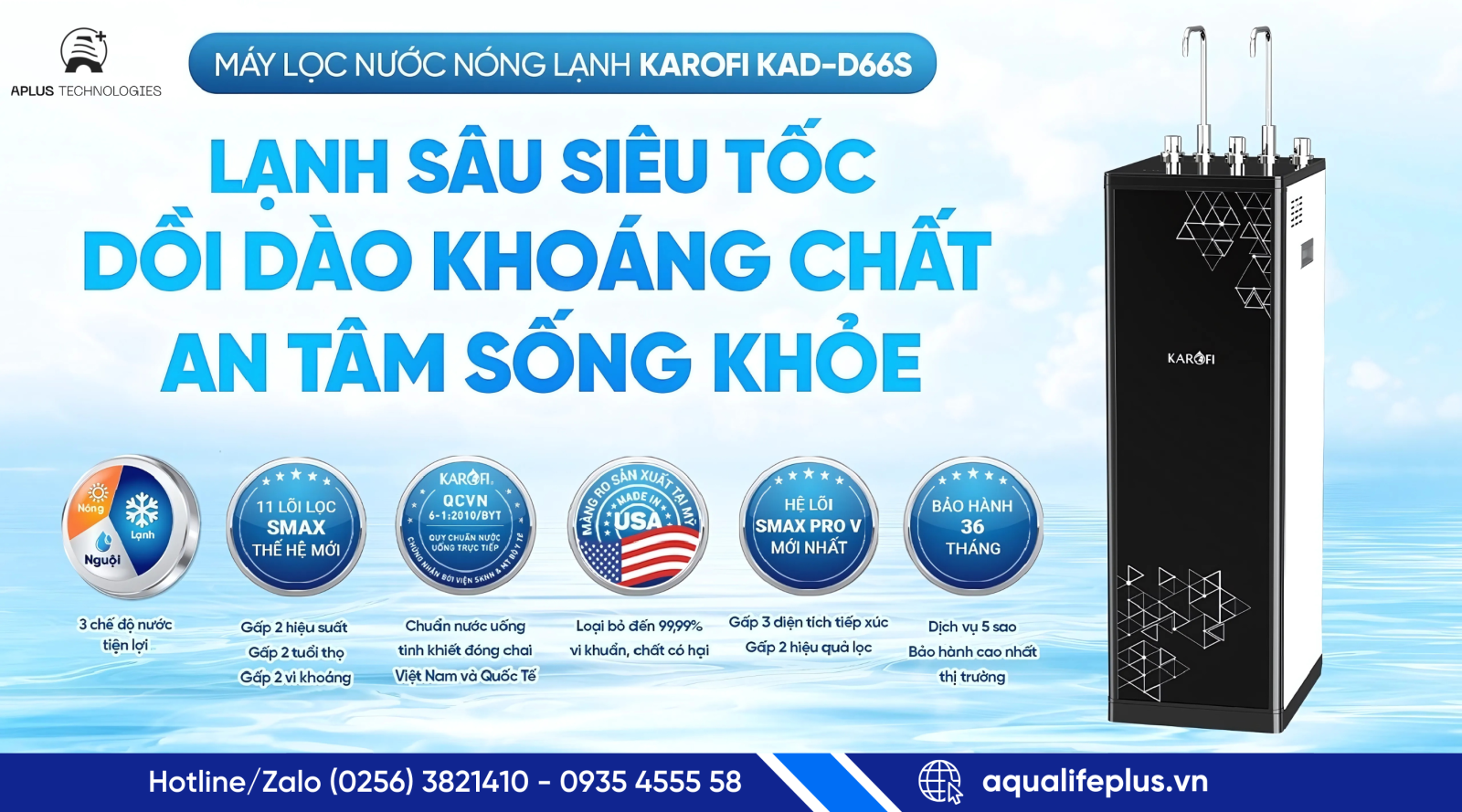 Máy lọc nước Karofi KAD-D66S là dòng máy lọc nước cao cấp tích hợp 3 chế độ nước: nóng – lạnh hậu – tinh khiết, đồng thời ứng dụng công nghệ lọc Smax và bổ sung khoáng chất, đem lại nguồn nước sạch vừa tốt cho sức khỏe vừa tiện dụng. Với thiết kế hiện đại, hiệu năng mạnh mẽ và nhiều tính năng thông minh, KAD-D66S là lựa chọn lý tưởng cho gia đình hiện đại, chung cư và nhà mặt đất.