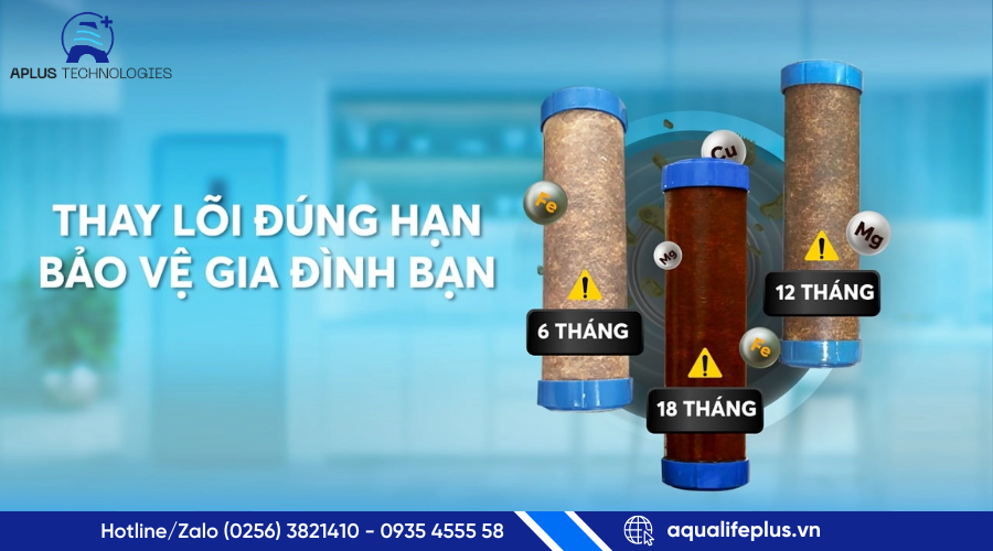 ⚠️ Với nguồn nước nhiều cặn, hoặc gia đình sử dụng nước thường xuyên, thời gian thay lõi cần rút ngắn để đảm bảo an toàn.